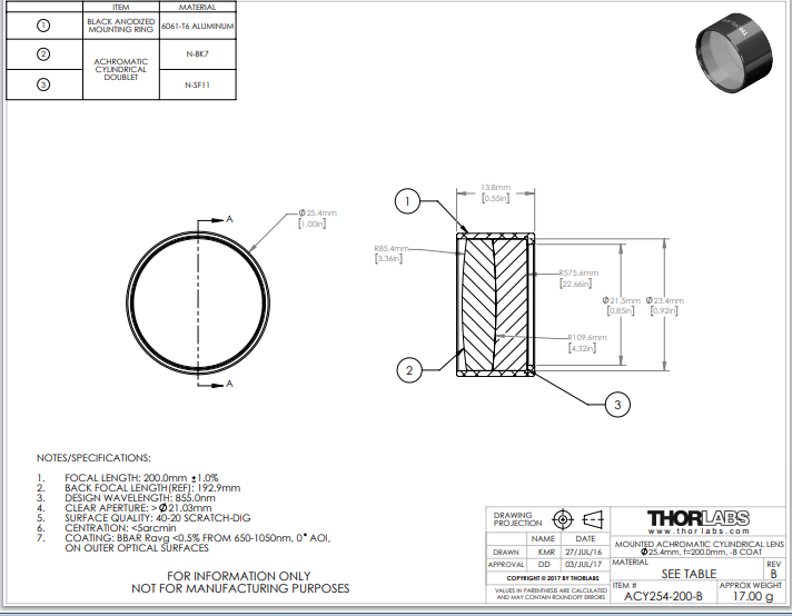 Thorlabs索雷博     ACY254-200-B   柱面消色差透镜