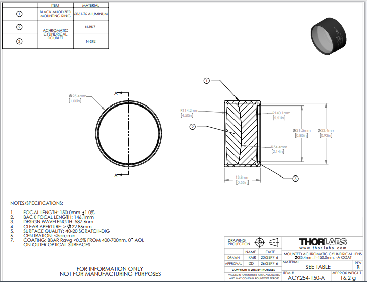 Thorlabs索雷博     ACY254-150-A   柱面消色差透镜