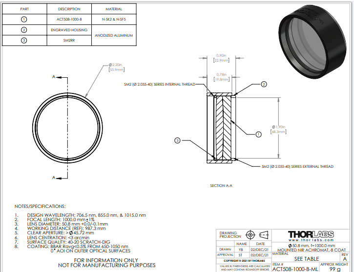 Thorlabs索雷博 ACT508-1000-B-ML 消色差双胶合透镜