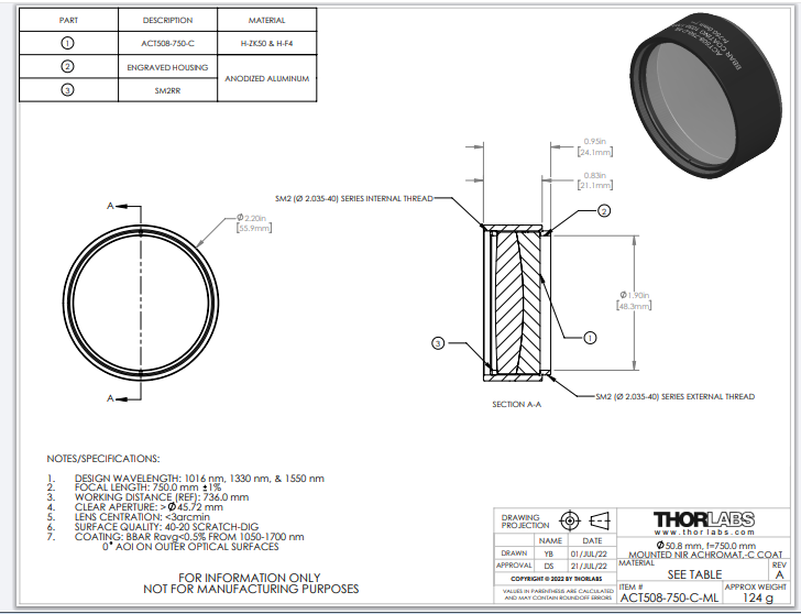 Thorlabs索雷博 ACT508-750-C-ML 消色差双胶合透镜