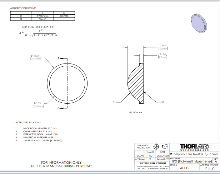 Thorlabs索雷博 AL115 TPX THz非球面透镜