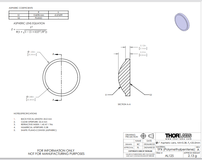 Thorlabs索雷博 AL125 TPX THz非球面透镜