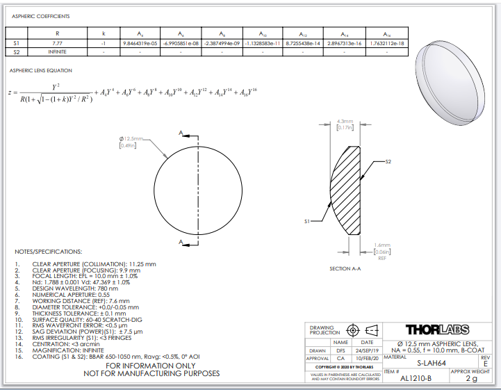 Thorlabs索雷博 AL1210-B 非球面透镜