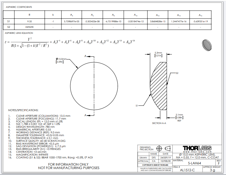 Thorlabs索雷博     AL1512-C   非球面透镜