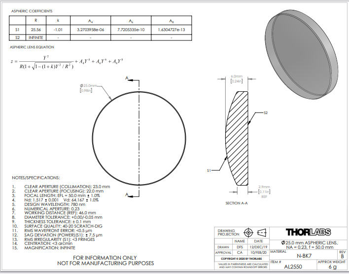 Thorlabs索雷博 AL2550 非球面透镜