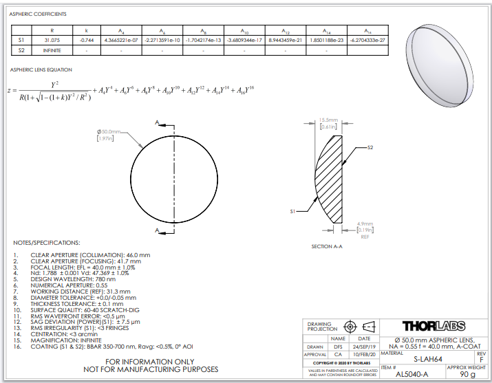 Thorlabs索雷博     AL5040-A   非球面透镜