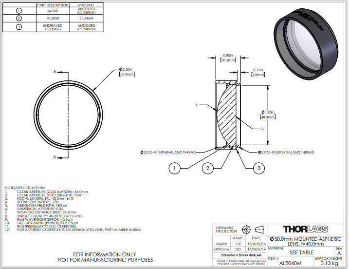 Thorlabs索雷博     AL5040M   非球面透镜