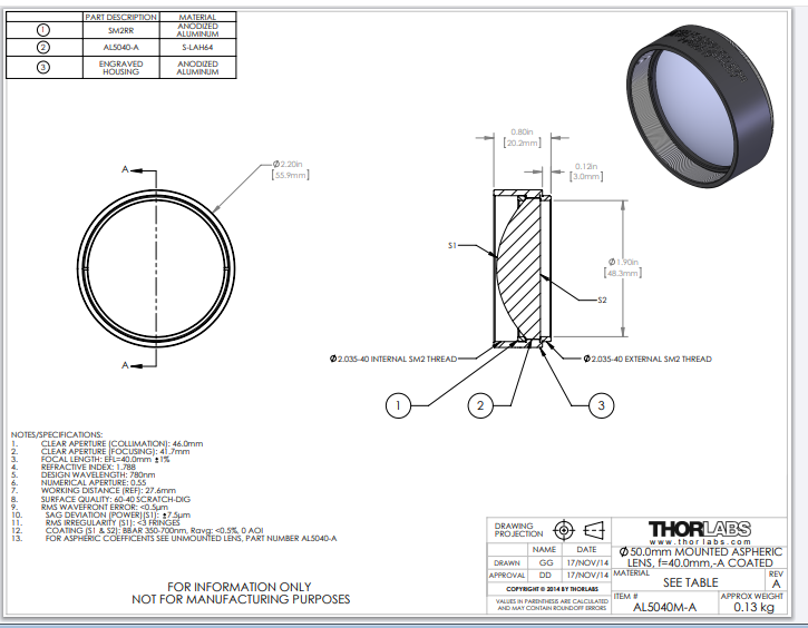 Thorlabs索雷博 AL5040M-A 非球面透镜