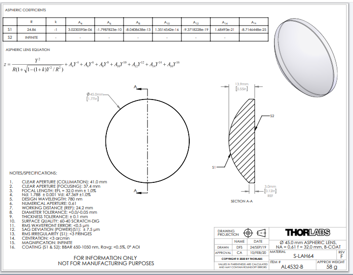 Thorlabs索雷博 AL4532-B 非球面透镜