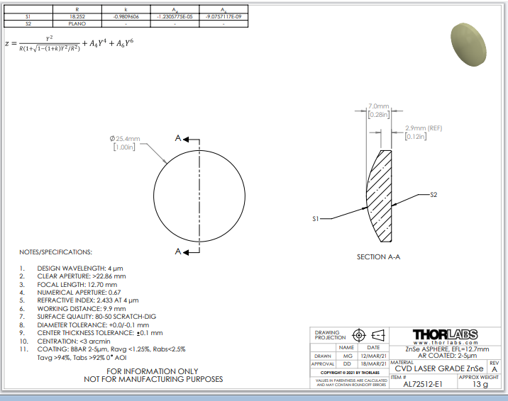 Thorlabs索雷博 AL72512-E1 非球面透镜