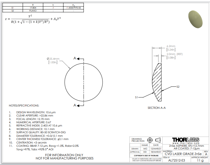 Thorlabs索雷博 AL72512-E3 非球面透镜