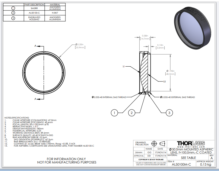 Thorlabs索雷博 AL50100M-C 非球面透镜