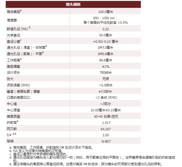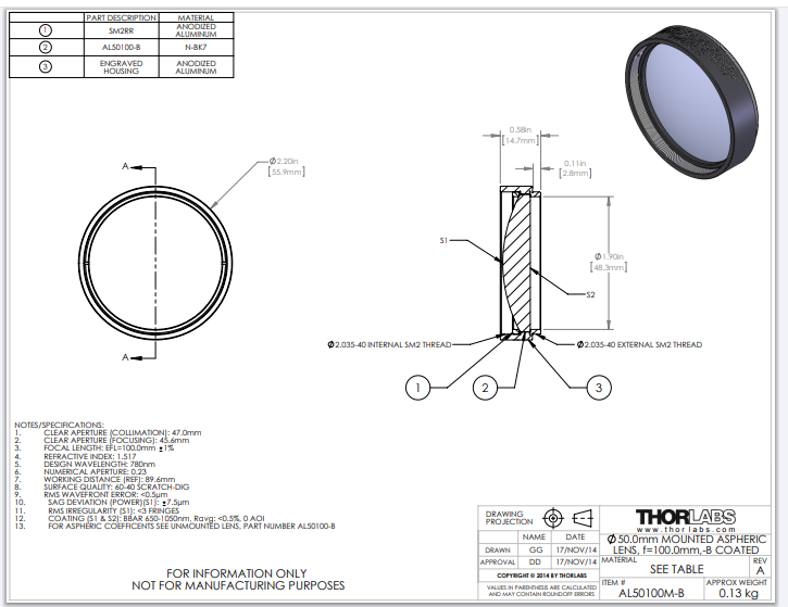 Thorlabs索雷博 AL50100M-B 非球面透镜