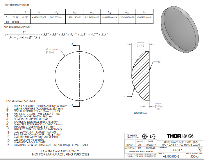 Thorlabs索雷博     AL100100-B   非球面透镜