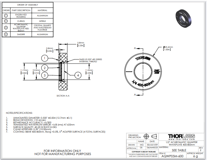 Thorlabs索雷博 AQWP05M-600 - 消色差四分之一波片