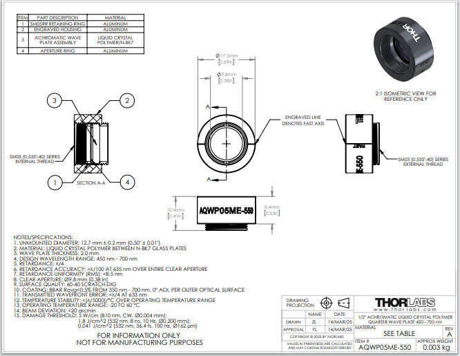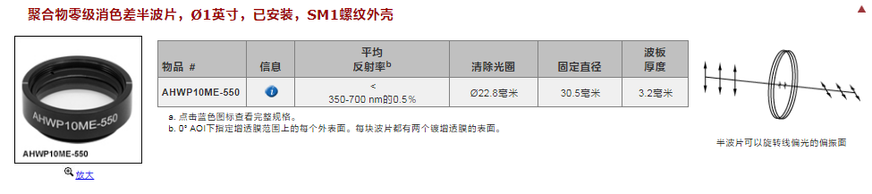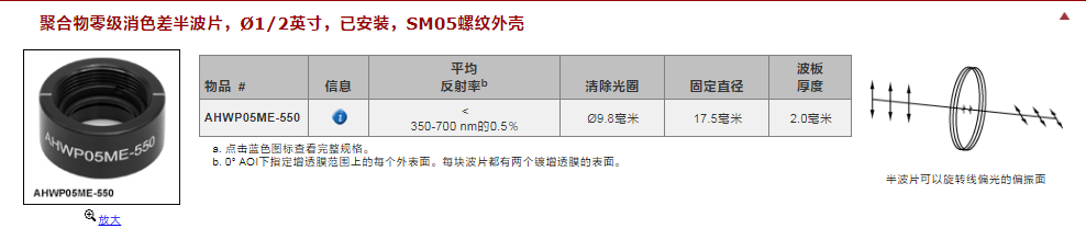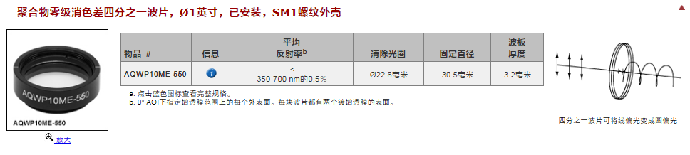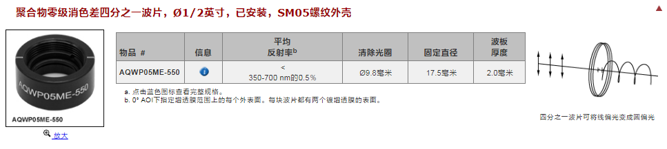 Thorlabs索雷博 AQWP05ME-550 - 聚合物零级消色差四分之一波片