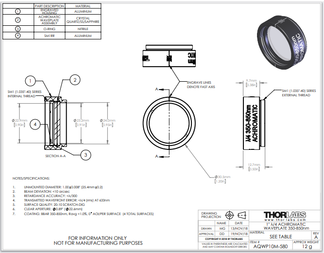 Thorlabs索雷博     AQWP10M-580 - 消色差四分之一波片