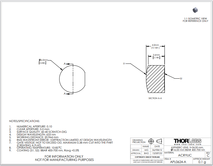 Thorlabs索雷博     APL0624-A   非球面透镜