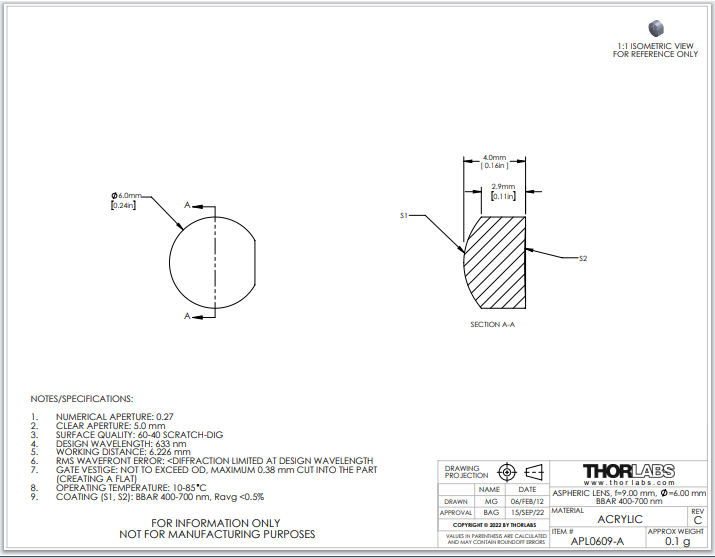 Thorlabs索雷博 APL0609-A 非球面透镜