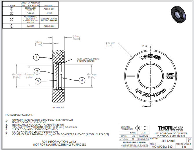 Thorlabs索雷博 AQWP05M-340 - 消色差四分之一波片