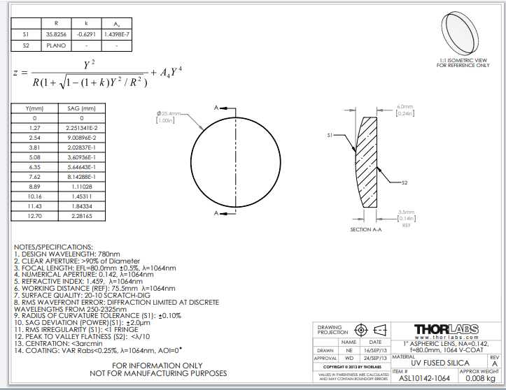 Thorlabs索雷博 ASL10142-1064 非球面透镜