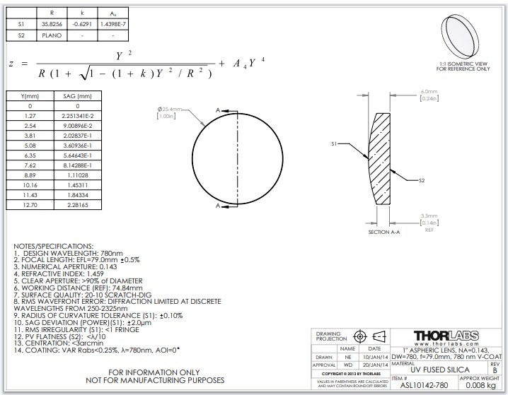 Thorlabs索雷博 ASL10142-780 非球面透镜