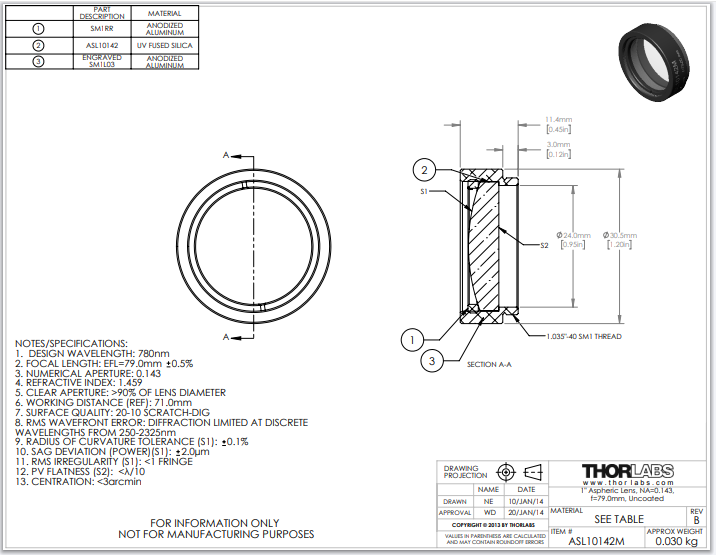 Thorlabs索雷博 ASL10142M 非球面透镜