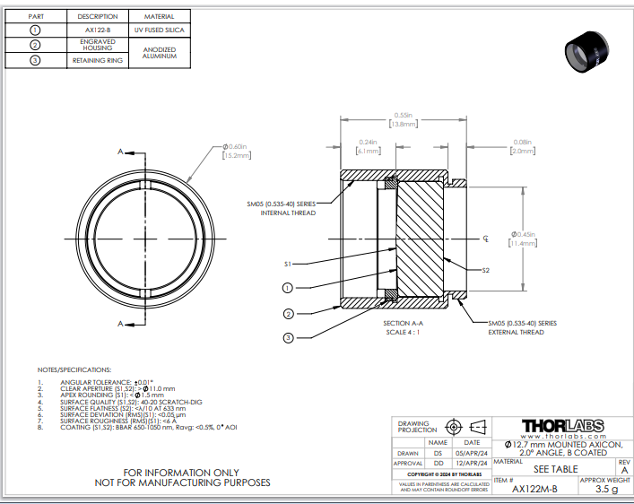 Thorlabs索雷博     AX122M-B   锥透镜
