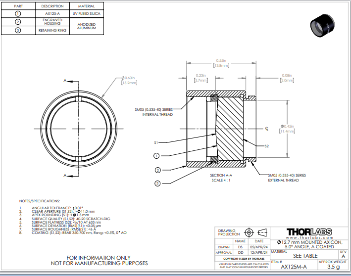 Thorlabs索雷博 AX125M-A 锥透镜