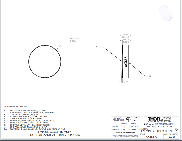 Thorlabs索雷博     AX252-A   锥透镜