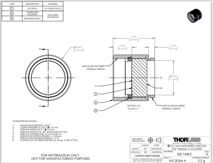 Thorlabs索雷博     AX1205M-A   锥透镜