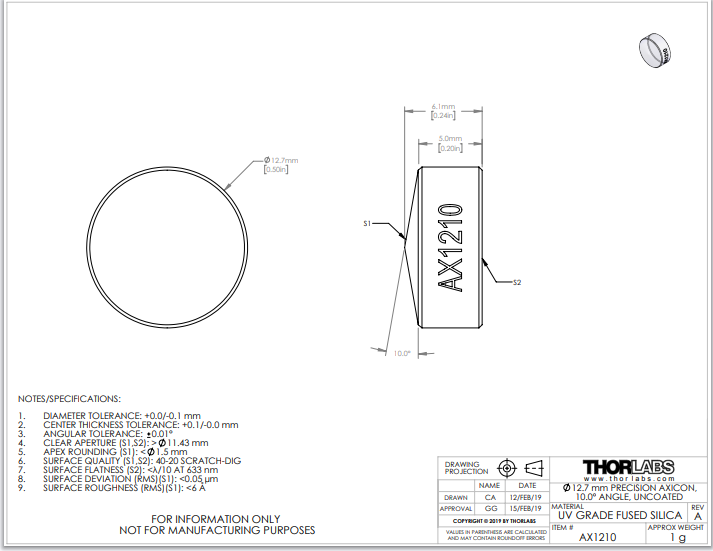 Thorlabs索雷博 AX1210 锥透镜