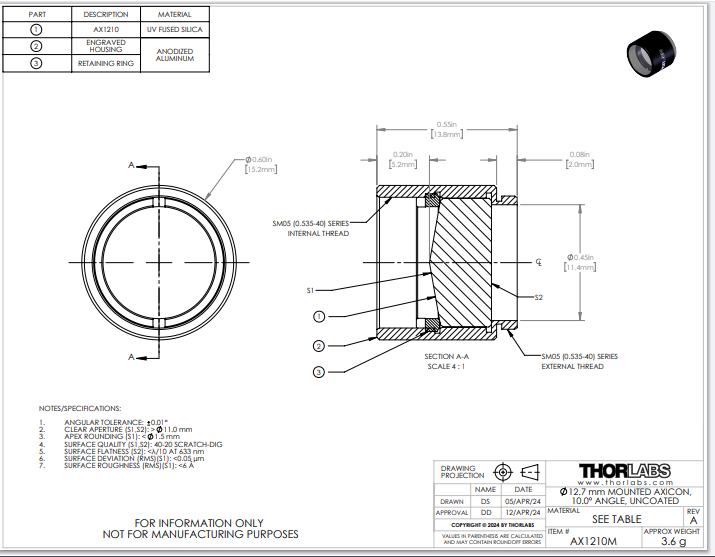 Thorlabs索雷博 AX1210M 锥透镜