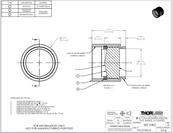 Thorlabs索雷博 AX1210M-A 锥透镜