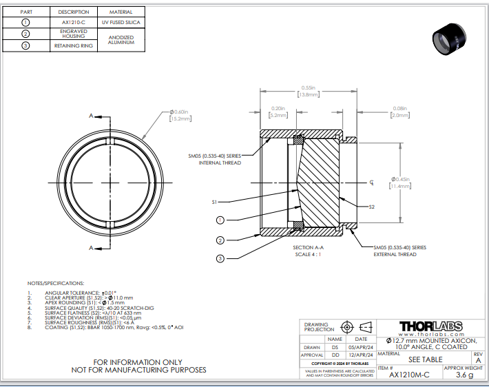 Thorlabs索雷博 AX1210M-C 锥透镜