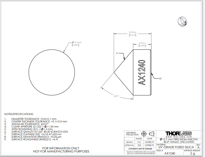 Thorlabs索雷博     AX1240   锥透镜