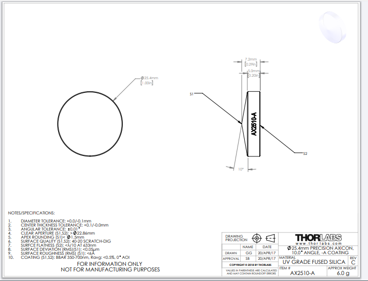 Thorlabs索雷博 AX2510-A 锥透镜