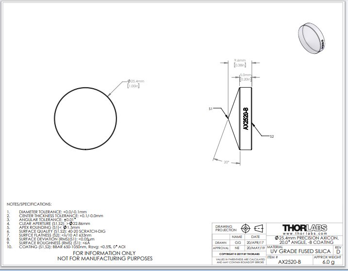 Thorlabs索雷博 AX2520-B 锥透镜