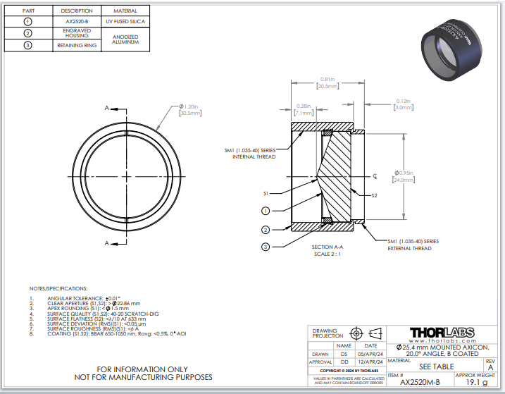 Thorlabs索雷博 AX2520M-B 锥透镜