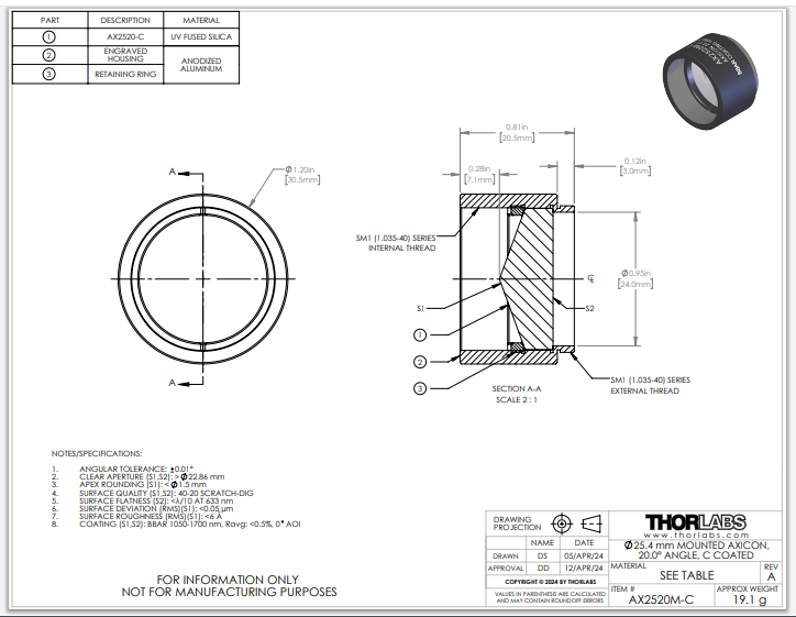 Thorlabs索雷博 AX2520M-C 锥透镜