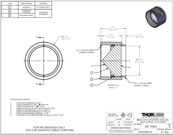 Thorlabs索雷博 AX2540M-A 锥透镜