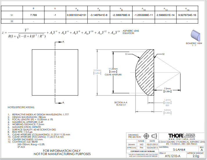 Thorlabs索雷博 AYL1210-A 平凸非球面柱面透镜