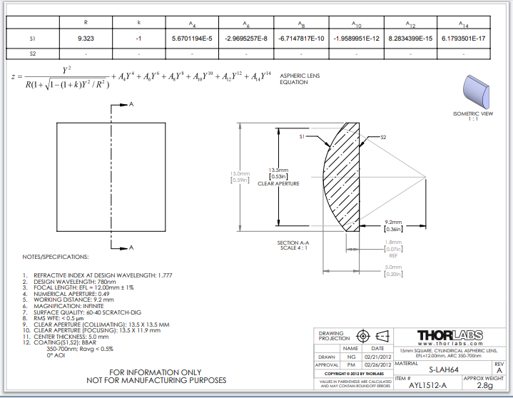Thorlabs索雷博 AYL1512-A 平凸非球面柱面透镜