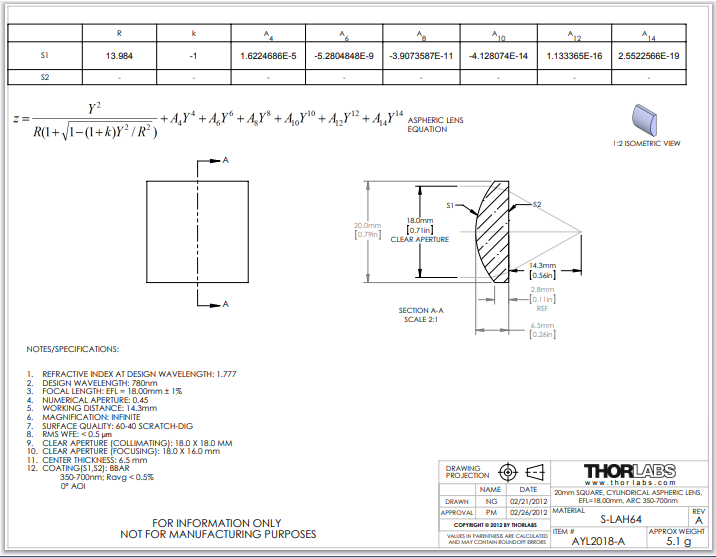 Thorlabs索雷博 AYL2018-A 平凸非球面柱面透镜