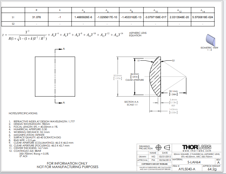 Thorlabs索雷博     AYL5040-A   平凸非球面柱面透镜