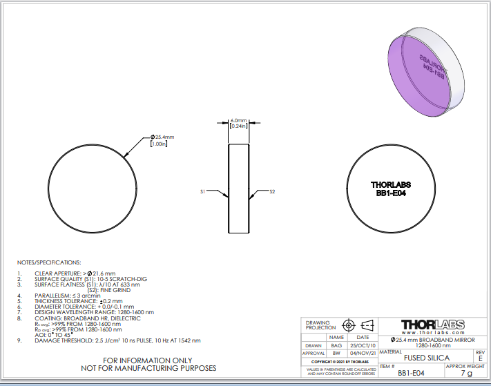Thorlabs索雷博     BB1-E04-10   平面反射镜