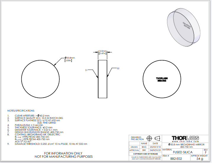 Thorlabs索雷博 BB2-E02-10 平面反射镜