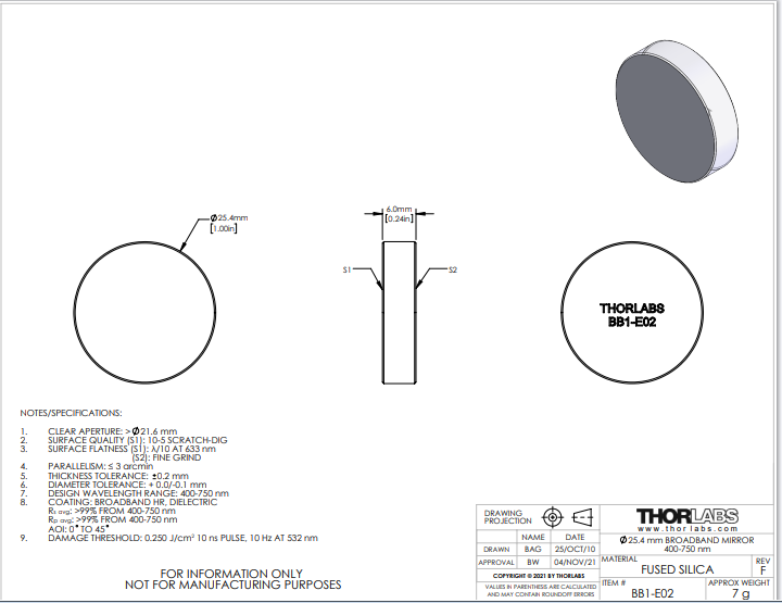 Thorlabs索雷博 BB1-E02-10 平面反射镜