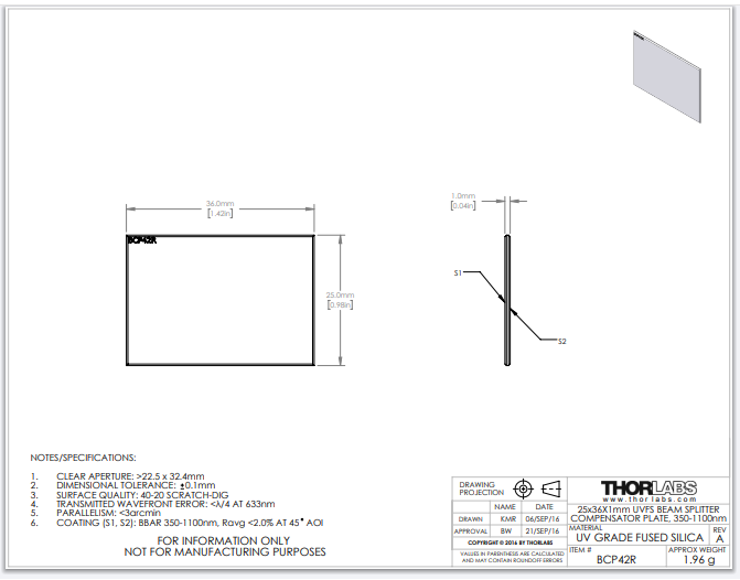 Thorlabs索雷博     BCP42R - 紫外熔融分束镜补偿片