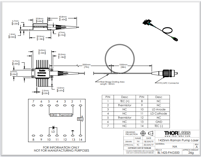 Thorlabs索雷博 BL1425-PAG500 - 光纤布拉格光栅稳定型激光器